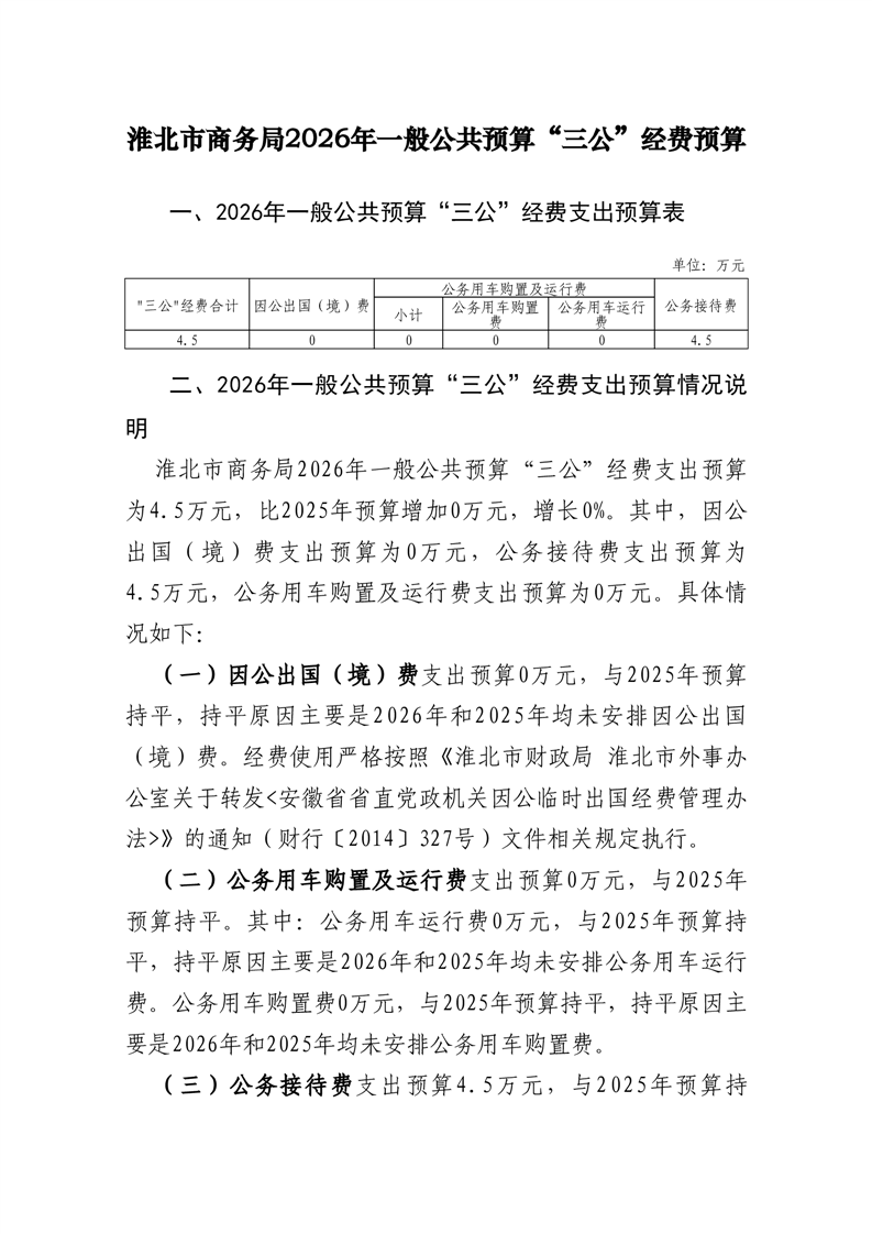 淮北市商务局2026年度部门一般公共预算财政拨款“三公”经费预算